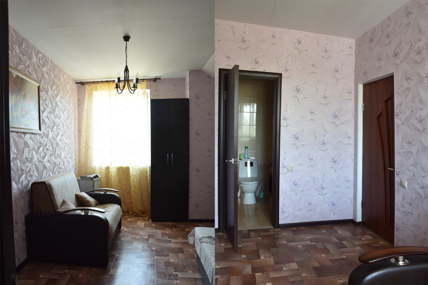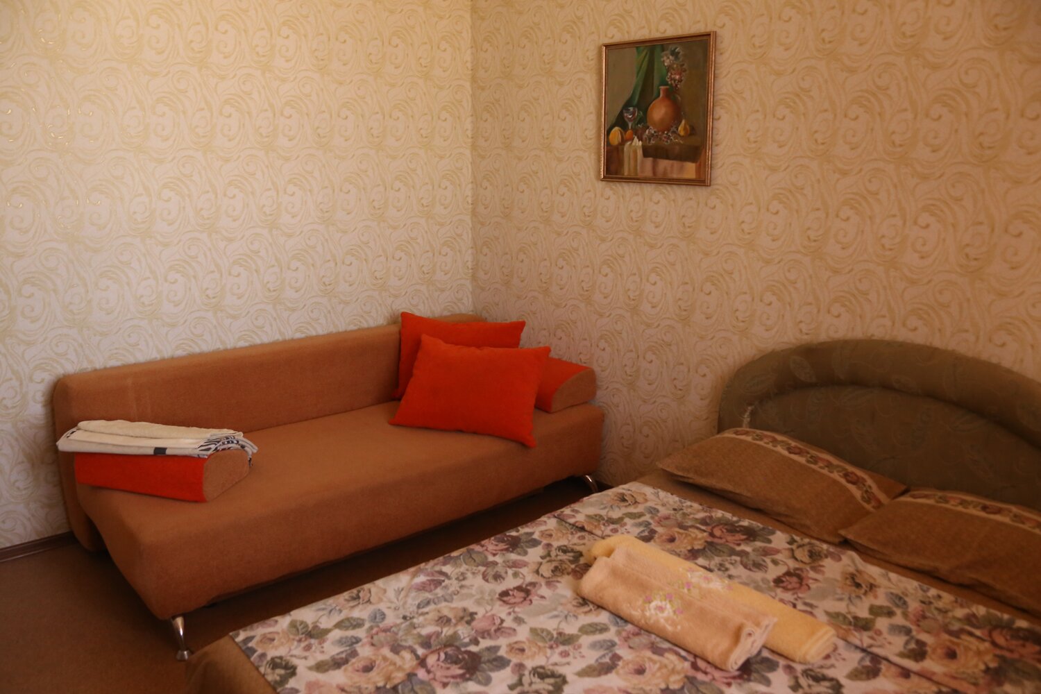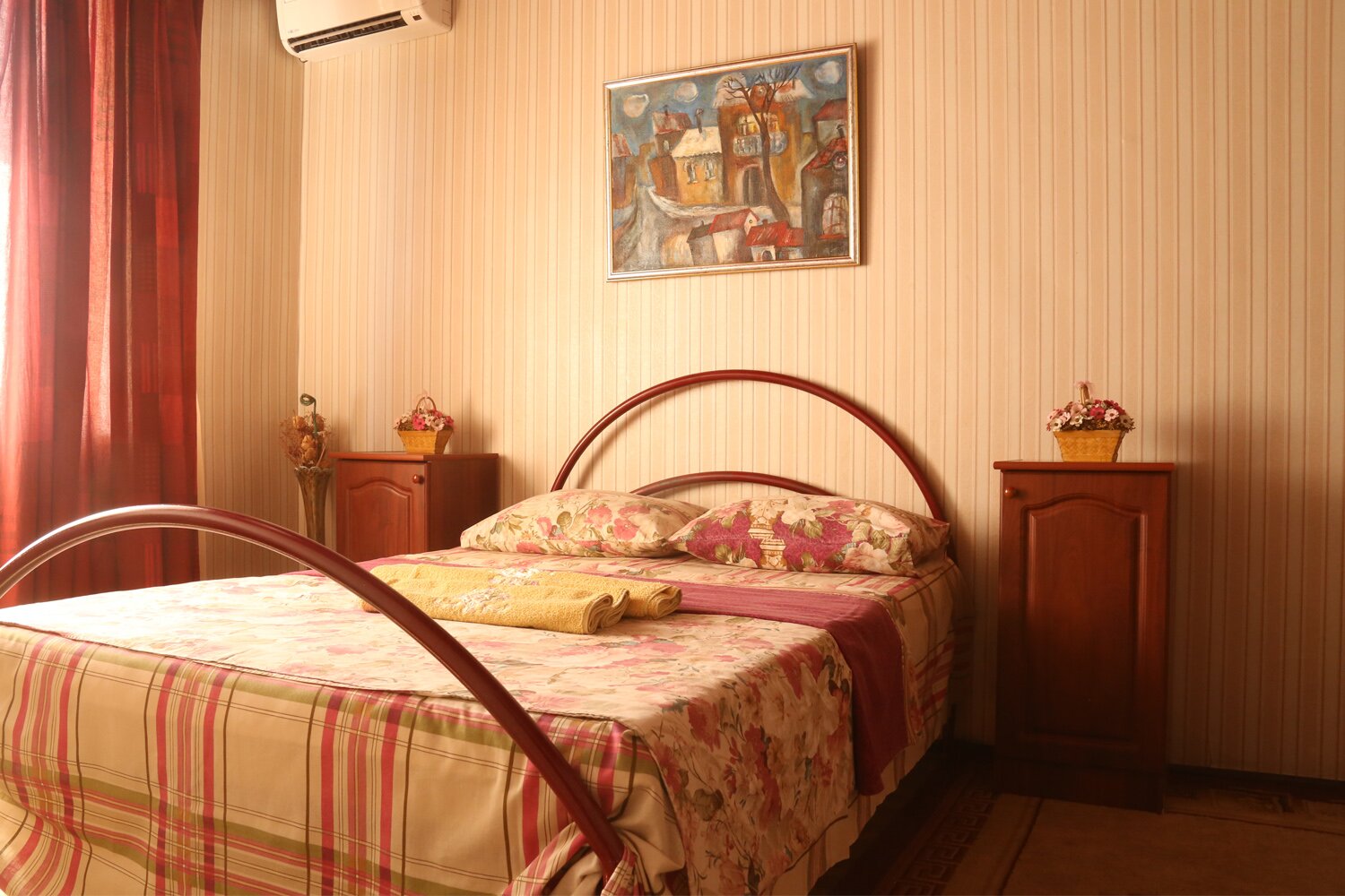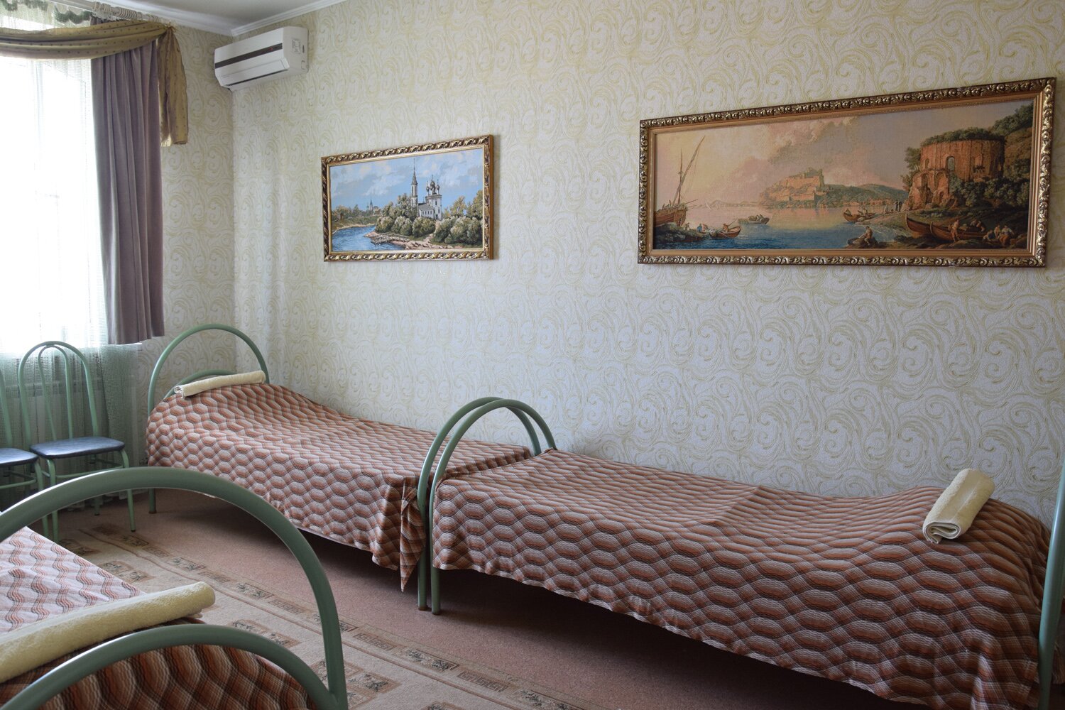 Две комнаты. Три односпальныее и двуспальная кровать. Кондиционер, холодильник, тв. Душ, туалет в номере. Wi-fi
