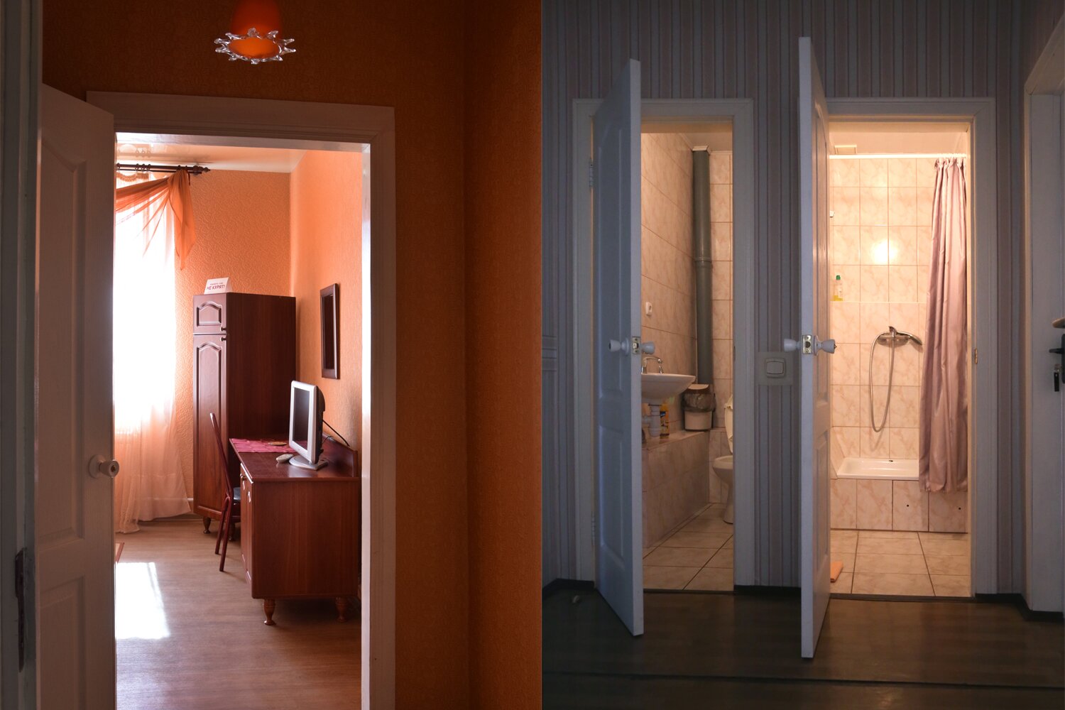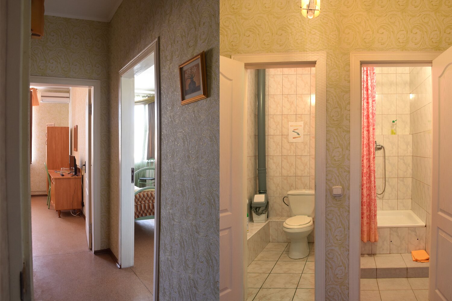 Две комнаты, в каждой по две односпальные кровати. Кондиционер, тв, wi-fi. Душ и туалет в номере